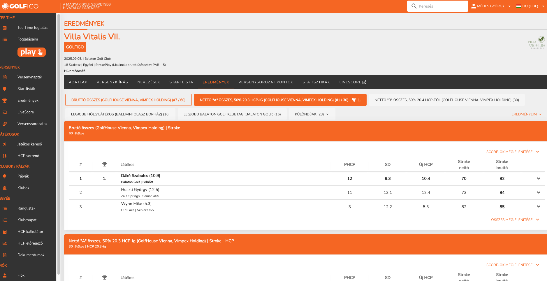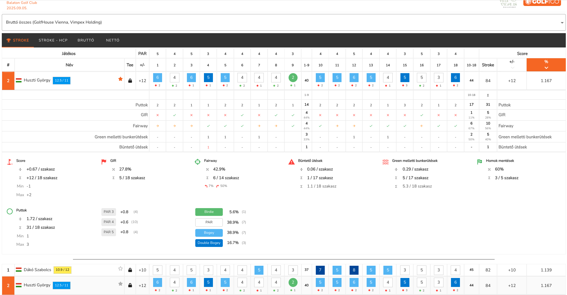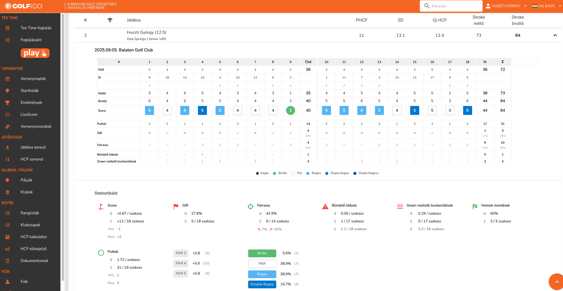 Egyrészt, amennyiben a játékos a játék/verseny köre alatt írja a saját statisztikáit (Fairway találat, Puttok száma, stb.) akkor az már nem csak a PLAY oldalon jelenítődik meg, hanem már a versenyeredmények oldalon is bármikor elérhető (lásd lentebb)