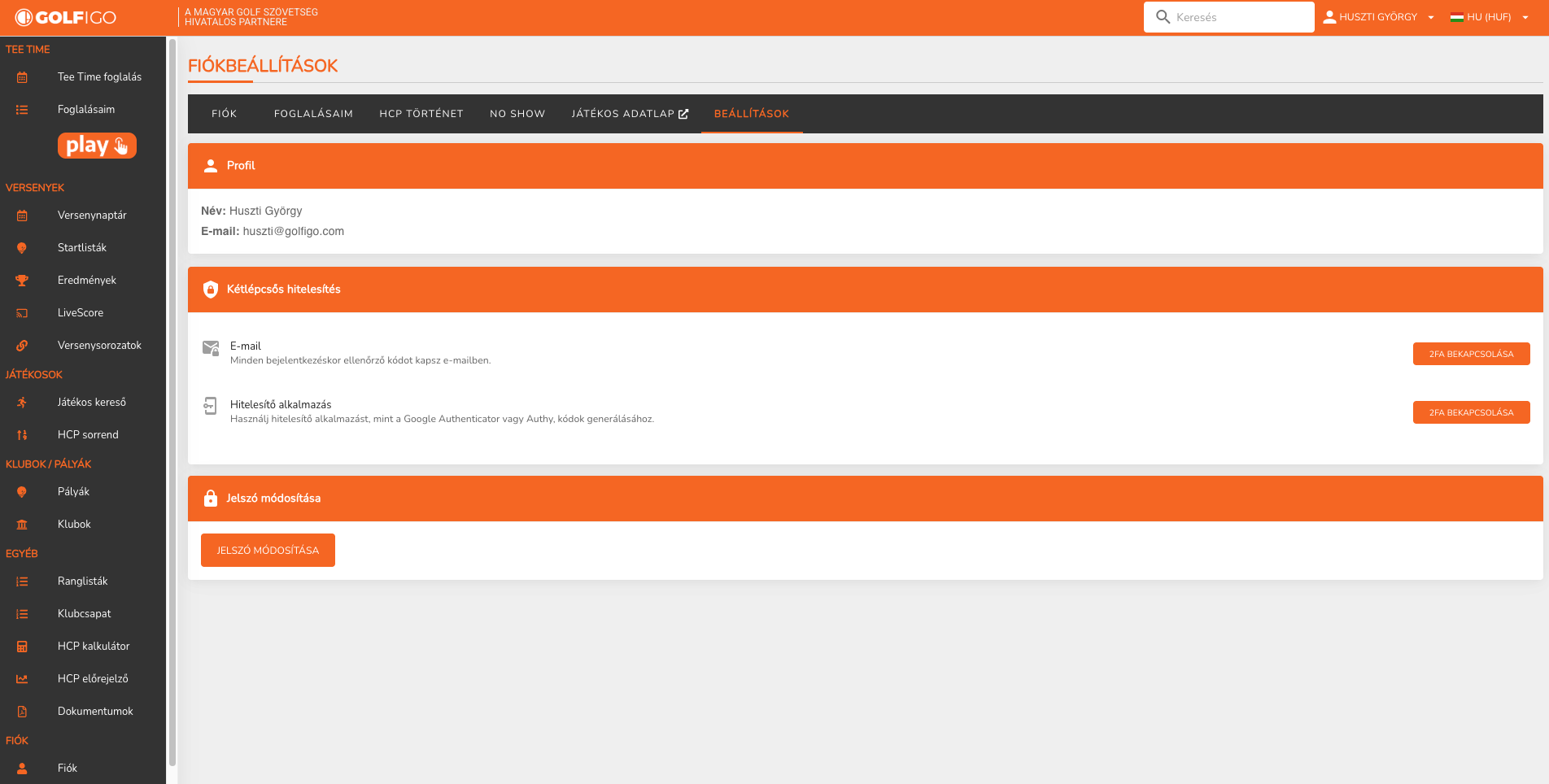 A rendszerbe történő belépés kapcsán megteremtettük a kétfaktoros azonosítás (2FA) lehetőségét (opcionális módon) ez egy fokozott biztonsági eljárást jelent, amely a jelszó (amit tudsz) mellett egy második tényezőt – pl. email-kódot, vagy hitelesítő alkalmazás használatát (lásd pl. Magyarország Ügyfélkapu) is kér a belépéshez. Ez jelentősen megnöveli az adott fiók védelmét, mivel a jelszó kikerülése esetén is megakadályozza az illetéktelen hozzáférést. Szimpla golfjátékos profilok esetében talán kevésbé ajánljuk a használatát, ugyanakkor érzékeny információkra rálátó profilok (pl. szövetségi jogosultsági szint) esetében kifejezetten ajánljuk, de természetesen a játékosok is használhatják amennyiben szeretnék.
